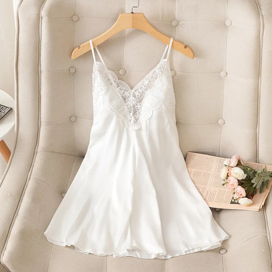 Versatile All-Season Ladies Silk Sexy Pajamas: High-Quality Women's Lace V-Neck Slip Dress in Satin, Plus-Size Sleepwear for Women's Nightdress.