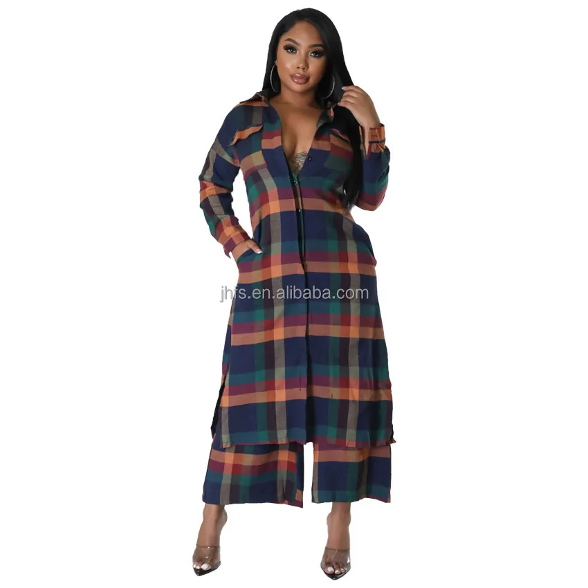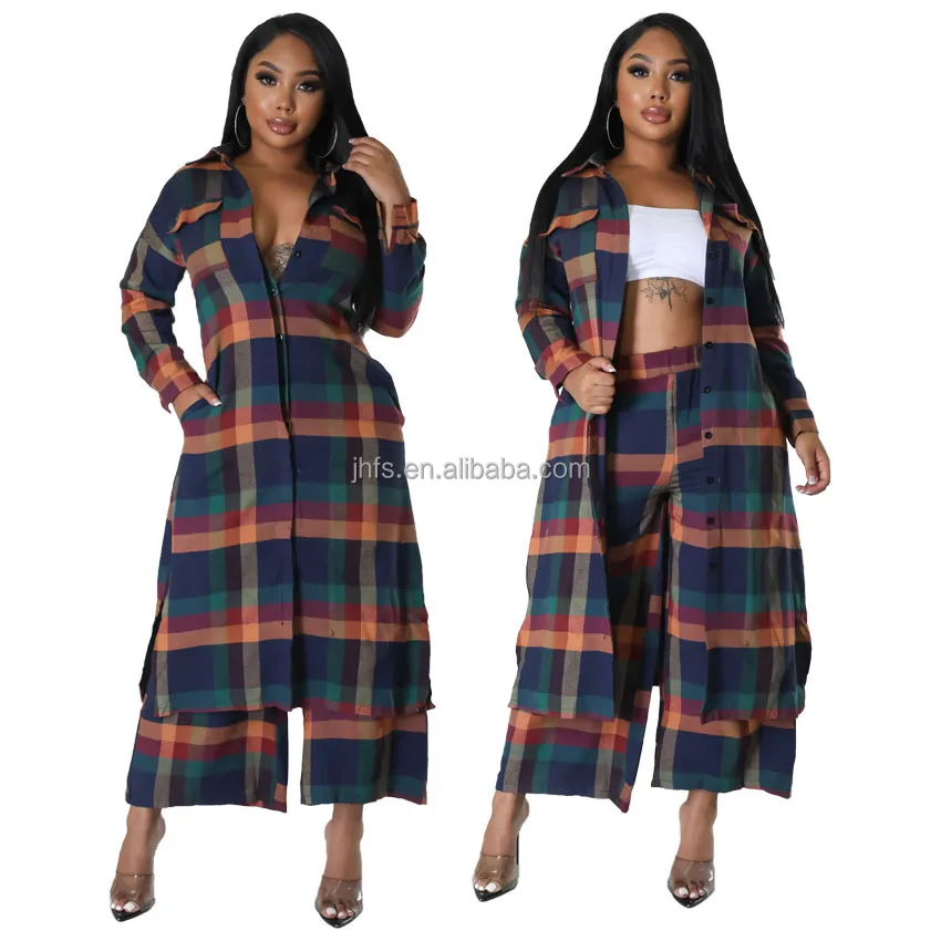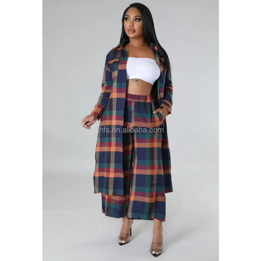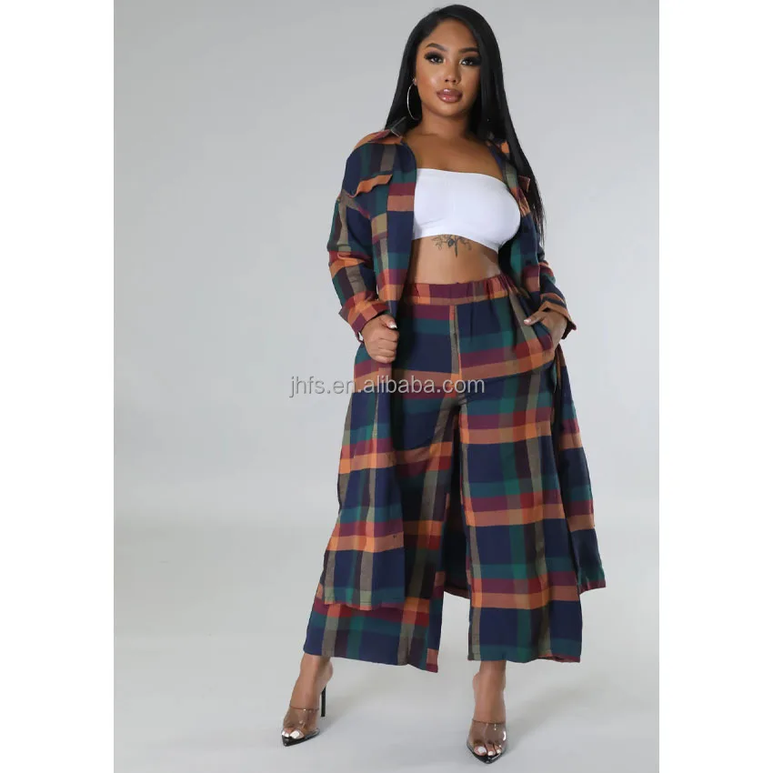 Explore our latest arrivals: a stylish plaid fabric long jacket paired with palazzo pants, creating a fashionable 2-piece set for women. Perfect for fall and winter, this ensemble offers a versatile and casual option suitable for office wear.