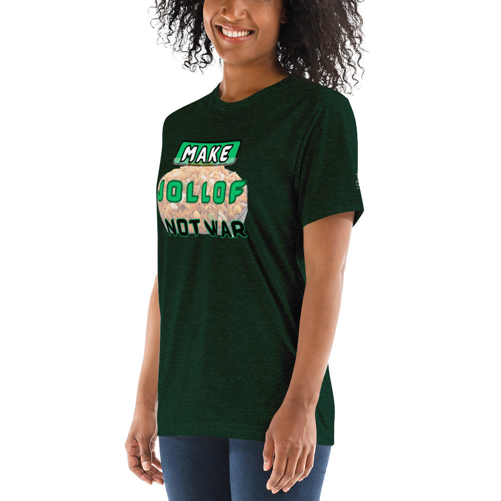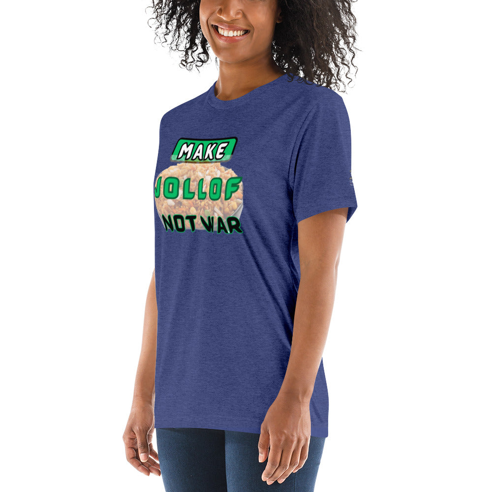 "Make Jollof Not War" - Crafted from tri-blend fabric, this t-shirt boasts a vintage, tailored appearance. Its remarkable durability ensures it can withstand countless washes while retaining its exceptional comfort.